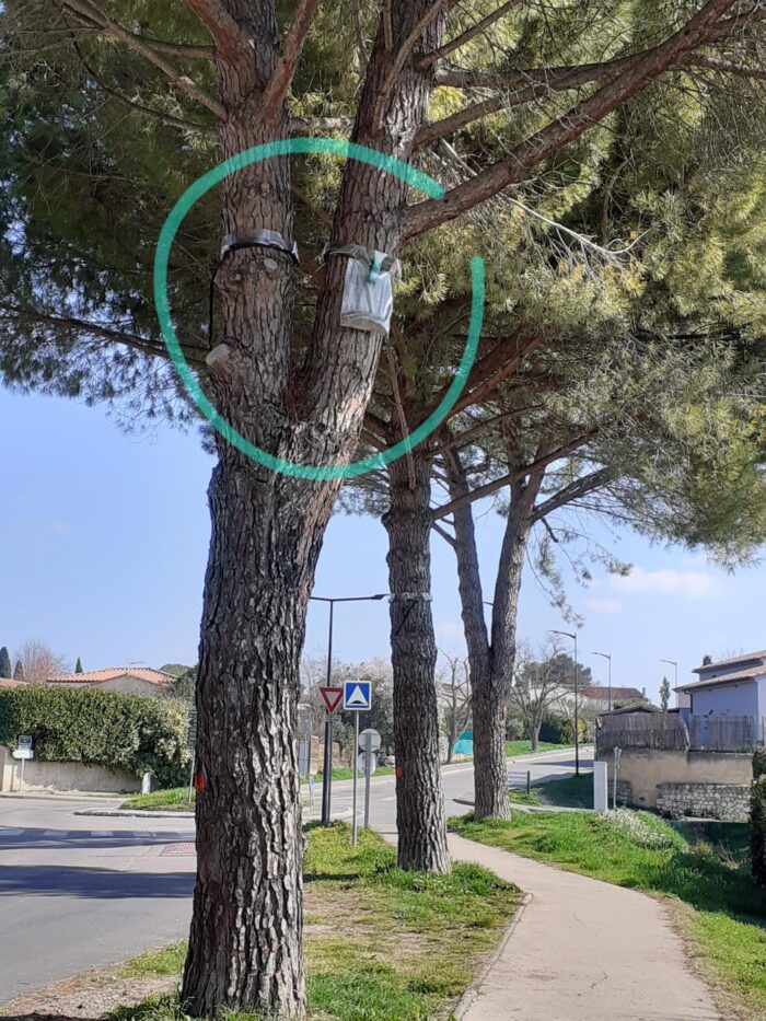 Les agents des services techniques, en partenariat avec La Tortue qui Secoue le Monde, ont installé la semaine dernière des pièges contre les chenilles processionnaires, sur des pins situés dans la cour de l’école maternelle de la Gare, dans l’avenue Jean Moulin, dans l’allée des Sauzet et au Jardin des Hauts de Saint-Estève.